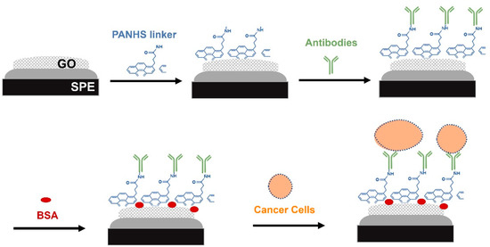 Graphene has seen increasing attention in recent years. It is a 2D sheet of carbon atoms that are arranged hexagonally and exposed on its surface [2,6]. Graphene, graphene oxide (GO) and reduced graphene oxide (rGO) are biocompatible carbon-based materials that are lately used in bioelectrochemical systems. These materials have been employed in many biosensing platforms due to their chemical stability, high electronic conductivity, large specific area, and high carrier mobility [7]. GO is synthesized by chemically oxidizing graphite and then can be immobilized on a solid support and functionalized with capturing molecules such as antibodies and a nucleic acid probe [8]. To improve the selectivity and sensitivity of fabricated biosensors, the immobilization of antibodies in the correct orientation on the electrode surface is critical step [5,8]. Therefore, linker molecules can be used as scaffolding molecules that offer an appropriate base for immobilizing antibodies [9]. In this study, the 1-pyrenebutyric acid-N-hydroxy-succinimide ester (PANHS) was immobilized on a GO electrode through π stacking, while the succinimidyl ester group was bound to the amine groups of an antibody. In the proposed label-free electrochemical-based biosensor, screen-printed carbon electrodes modified with GO were functionalized with the scaffolding molecule, PANHS, and capturing molecule, the anti-OV-6 antibody to detect intact hepatic cancer cells (HepG2) (Figure 1). Further, a reservoir chamber module was used to enable the continuous exposure of cancer cells to the functionalized surface and thus increase the capture of target cells in the specimen. By optimizing the detection conditions and assessing the generated signals from CV measurements, promising biosensing platforms were developed.