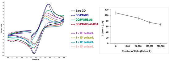 This study aimed to design a simple approach to detect intact cells by using an electrochemical technique. The fabricated electrochemical sensor was characterized using CV measurements and all measurements were conducted in a 5 mM ([Fe(CN)6]3−/4−) redox couple and 100 mM KCl. CV is a powerful electrochemical method that is commonly used to monitor the changes in modified sensor surfaces. To confirm the functionalization of the developed sensor on the GO electrode, CV measurements were taken after each electrode modification step as follows: bare GO, GO/PANHS, GO/PANHS/Ab, and GO/PANHS/Ab/BSA electrodes. The current response decreased noticeably after each addition step taken on the electrode surface (Figure 2).