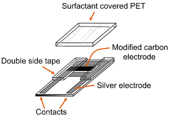 Planar three-electrode screen-printed structures with a carbon working electrode (Ø = 1.8 mm) were produced by Rusens Ltd. (Moscow, Russia). Flexible 250 µm thin polyethylene terephthalate film (PET) obtained from Vladimirskii Khimicheskii Zavod (Vladimir, Russia) was used as the substrate. Planar two-electrode structures with a carbon working electrode (Ø = 2.25 mm) and Ag-reference electrode were produced using silver polymer paste (NPP “Delta-Paste”, Zelenograd, Russia), carbon paste (C2030519P4, Sun Chemical, South Normanton, UK) and UV curable insulating paste (UNICA, Ternat, Belgium).