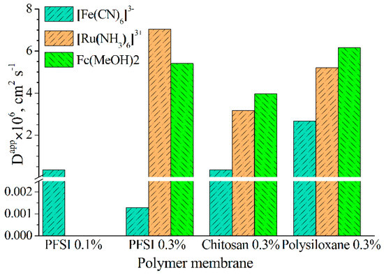 Significantly lower apparent diffusion coefficients were obtained for the hexacyanoferrate anion. The negatively charged perfluorosulfonated ionomer dramatically hampered the diffusion of the ferricyanide ion (Figure 2). However, an effective diffusion coefficient in the case of 0.1% PFSI in the membrane-forming mixture is comparable to that found for the 0.3% chitosan mixture (Figure 2).