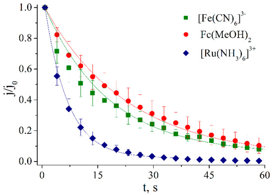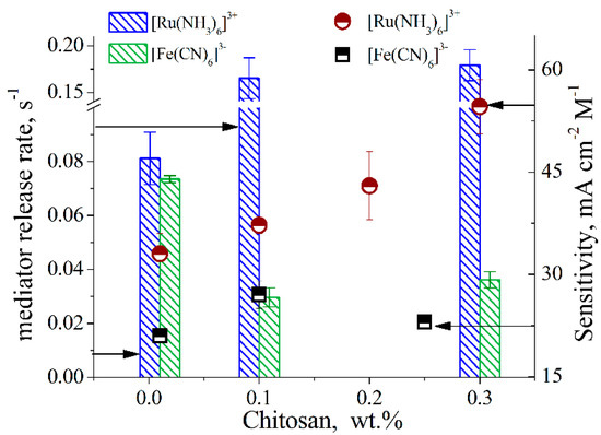 Figure 3 illustrates the decrease in peak current registered upon the cycling of electrodes modified with different mediators and chitosan in buffer solution. One can consider the mediator release rate, which is proportional to the first derivative: dj/dt = A∙k (see Equation (2)). The rate of mediator release from the chitosan membranes was also found to be dependent on the density of the membrane (Figure 4). As expected, the increase in chitosan content in the membrane-forming mixture hinders the release of hexacyanoferrate (III) from the membrane due to the electrostatic binding of negatively charged [Fe(CN)6]3− to the charged -NH3+-groups in polymer. At pH 7.4, approximately 6% of the chitosan amino group is protonated. That is why a small amount of chitosan deposited on the electrode does not affect the release rate of the mediators.