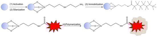 Materials used included glass beads, 1-Ethyl-3-(3-dimethylaminopropyl)carbodiimide (EDC), N-hydroxysuccinimide (NHS), acetic anhydride, acetonitrile (AcN), acetone, itaconic acid (ITA), 2-Hydroxyethyl methacrylate (HEMA), ferrocenylmethyl methacrylate (FcMMA), Ethylene Glycol Dimethacrylate (EGDMA), Trimethylolpropane trimethacrylate (TRIM), Pentaerythritol tetrakis (3-mercaptopropionate) (PETMP), Benzyl diethyldithiocarbamate, Dimethylformamide (DMF), ethanol (EtOH), 3-aminopropyltriethoxysilane (APTES), phosphate-buffered solution (PBS) tablet, and perfluorooctanoic acid (PFOA).
