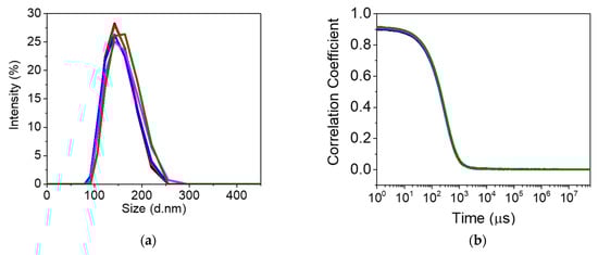 Dynamic light scattering analysis (n = 5) of the PFOA-nanoMIPs showing (a) particle size distribution and (b) the plot of correlation coefficient vs. time (n = 5).