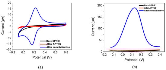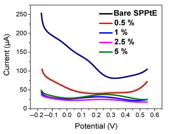 To allow maximization of nanoMIP immobilization, the functionalization of SPPtE was investigated. Basically, the effect of APTES concentration (0.5, 1, 2.5, 5% v/v) on the electrochemical response of nanoMIPs was studied by CV and DPV measurement (Figure 4). As visible from DPV measurements in PBS solution, the electrochemical responses of nanoMIPs increase in the intensity peak current by increasing APTES concentration, which can be more accommodating toward the receptor on the electrode surface. For that reason, 5% of APTES was chosen as the optimum condition for electrode functionalization.
