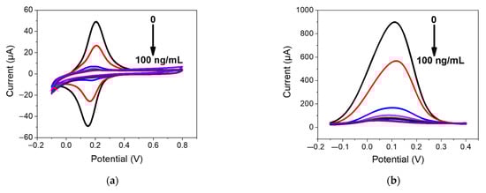 The electrochemical sensing of PFOA with the developed PFOA-nanoMIP sensor was investigated by DPV and CV measurements, respectively. The sensor was exposed to distinct PFOA concentrations ranging between 1.5 and 100 ng/mL in PBS solution (Figure 5).