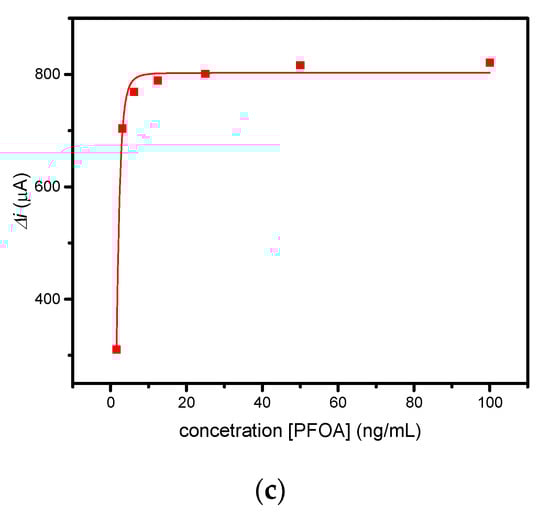 As shown in Figure 5a, the electroactivity of nanoMIPs greatly decreased with increasing concentration of PFOA. The latter was most visible by DPV measurements (Figure 5b), which can be explained as the interaction of PFOA with the selective cavities. The redox properties of ferrocenylmethyl methacrylate give electroactive properties to nanoMIPs, used for electrochemical sensing of non-electroactive molecules. The selective interaction of the electrode modified with nanoMIPs with the non-electroactive target molecule causes a decrease in the redox current of the ferrocene groups, proportional to the PFOA concentration. This can be attributed to the effect of the non-electroactive analyte on the redox processes of ferrocene. The attenuation of the PFOA binding current results in a restriction of the counterions that access the anchored redox probe to balance the charge, thus hindering the transfer of electrons [15]. In particular, the platform was very sensitive toward PFOA, with a slope of 0.578 μA/ng mL−1 and a linear working range between 0 and 6 ng mL−1. The limit of detection, LOD, calculated as 3s/m where s was the standard deviation of the intercept and m is the slope of the regression plot, was 0.84 ng mL−1. Saturation of cavities was reached at 50 ng/mL, due to the occupancy of cavities. In these cases, the optimal mathematical model, which introduces the nonlinearity, is the sigmoidal model; therefore, the curve fitting was performed using the saturation link of the nonlinear Hill function equation [16] (Figure 5c). The proposed sensor shows high sensitivity and affinity with the analyte. These preliminary results currently encourage us to conduct further experiments with respect to lower concentrations, selectivity properties, and application to real water samples, which we will report shortly.