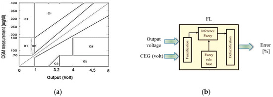 Proposed methodology of mapping the voltage-from-Arduino-to-glucose concentration and estimating the error tolerance using FL: (a) Clarke grid using voltage output on horizontal axis; (b) proposed fuzzy logic with two inputs of voltage and CGM and error output.