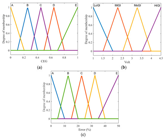 Figure 3. Membership functions of input and output in the proposed FL system: (a) MFs of analoge-voltage input; (b) MFs of CEG input; (c) MFs of the FL output. - Inference: contains the fuzzy if–then rules. In this study, the fuzzy rules were built based on the experimental observations of glucose and its coordinates on the areas of Clarke grid. The used fuzzy rules include:If Voltage is LoGl and CEG is A then Error is A.If Voltage is LoGl and CEG is B then Error is B.