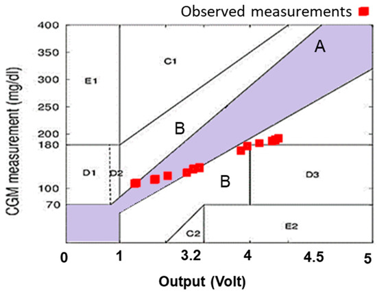 In this study, the horizontal axes of CEG (Figure 2a) represent the output voltage of Arduino based on preliminary calibration process. The main objective of this methodology is to find the expected error tolerance of glucose concentration, which represents the confidence interval of the estimated glucose value. To estimate the error in the observed glucose, FL (Figure 2b) was used to evaluate the output voltage from Arduino and the average accuracy of measured voltage based on CEG’s areas (in scale of [0 to 1]).