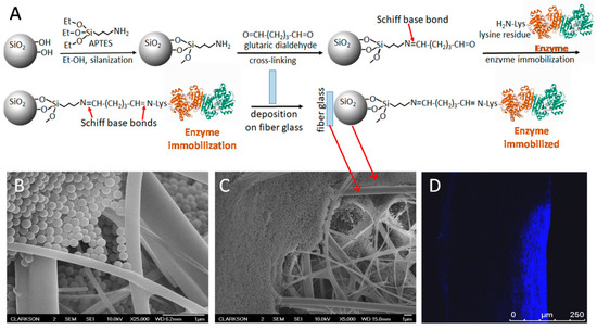 (A) The scheme of immobilization of enzymes onto SiO2-NPs. (B,C) Scanning electron microscopy images showing the enzyme-functionalized SiO2-NPs deposited on fiberglass support. (D) Microphotography of confocal microscopy visualized the distribution of enzyme-functionalized SiO2-NPs in the sensing spot. The penetration of enzyme-functionalized SiO2-NPs into 125 µm of the glass paper (blue color) support corresponds to app. 625 of single monolayers of SiO2-NPs (200 nm in diameter each).