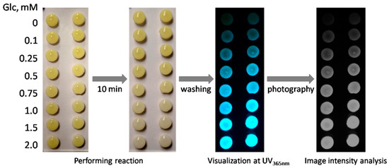 The principle of this approach is based on the analysis of the intensity (brightness) of photography of the sensor plate taken with a smartphone camera in grayscale. The brightness of the image correlates with the fluorescence intensity of the sensor’s spots which is produced by enzymatic oxidation of phenazine methosulfate or its derivative used as a fluorescence probe at UV 356 nm irradiation, where the amount of the reduced dye depends on the concentration of the target analyte (the enzymatic substrate) in the tested sample (Figure 1A,B).