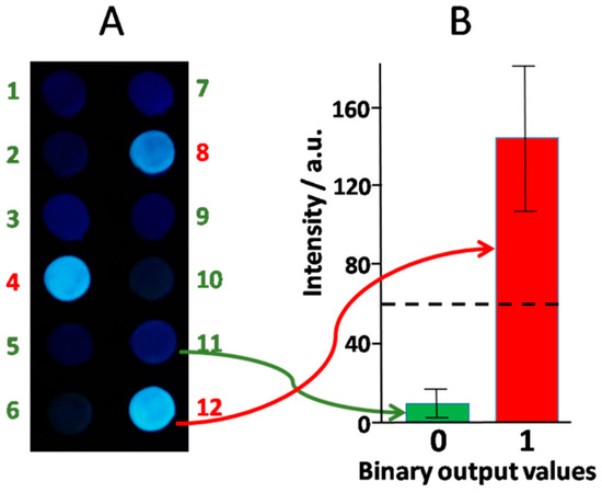 The sample of using the proposed fluorescent biosensor system for multianalyte analysis using Boolean logic gates. Each pair of sensing spots is modified with different enzymes selective to a unique analyte. When all the sensor spots are treated with the same tested sample (e.g., human serum from one patient) the increased amount of some biomarkers will provide the intensive spot’s fluorescence (output 1) (see intensive blue spots in (A)) when their normal level will be taken as “no output” (output 0) (see dark blue/weakly visible spots in (A)). (B) The bar chart shows the fluorescence intensity of the spots corresponding to the logic outputs 0 and 1 derived from the images by calculating the image brightness using the ImageJ software.