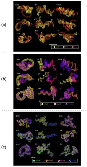 Tertiary structures of the nine aptamers modeled under different conditions. (a) Different temperatures with color correspondence to 8.0 °C in yellow, 20 °C in orange, and 30 °C in red. (b) Different concentrations of [Na+] with color correspondence to 1.0 mM in yellow, 50 mM in rosy color, and 150 mM in purple. (c) Different concentrations of [Mg2+] with color correspondence to 1.0 mM in green, 2.0 mM in orange, 3.0 mM in rosy color, and 4.0 mM in blue.