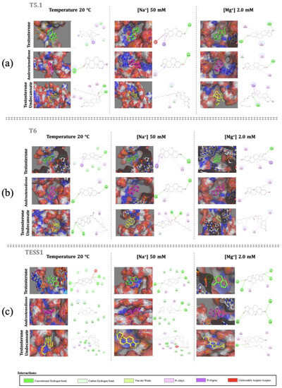 According to Figure 2, the conformations of the aptamers result in a kind of cavity or pseudo-cavity, in which the target, namely, testosterone, androstenedione, or testosterone undecanoate, is already located for its union. These junctions are mostly composed of conventional hydrogen bonds, carbon–hydrogen bonds, pi–alkyl bonds, and pi–sigma bonds.