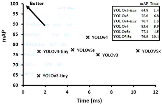The detailed results are shown in Table 1, with YOLOv4 and YOLOv4-tiny presenting excellent results in terms of mAP, model size, and detection time. In addition, it is believed that mAP could be improved by improving label quality, increasing training data, tuning hyperparameters, and using data augmentation. More precise labeling, such as polygonal segmentation, could also help improve the results.