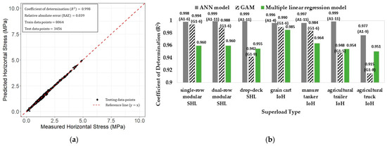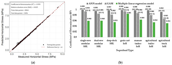 Prediction accuracy evaluation in case of: (a) ANN model A1–6 predicting critical horizontal stress at the top of the PCC slab when subjected to single-row modular-type SHL; (b) models showing the best prediction accuracy for each prediction approach and superload type.