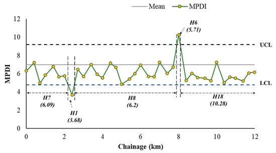 The control limits identify an unexpected variation in the quality control process. In the past, researchers [,] have also used two standard deviations (in place of three standard deviations) to recognize the warning limits without compromising the quality of the established control limits and the process capability. Thus, in this study, the control limits of the MPDI accounted for the use of two standard deviations to rationally ascertain the homogeneous segments and the overall process stability.