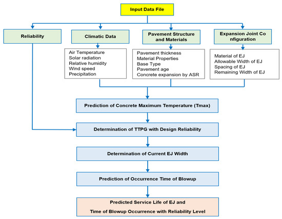 In this study, a user-friendly tool called the pavement growth and blow-up analysis (PGBA) model was developed using MATLAB to estimate the service life of expansion joint and blow-up occurrence time. Figure 1 illustrates the overall framework for the PGBA model. For the input file, there are four groups of input data, which are climatic data, pavement structures and materials, configuration of the expansion joint, and design reliability. The backbone of the run file consists of the prediction of maximum concrete temperature (Tmax), the prediction of the trigger temperature for pavement growth (TTPG), the prediction of alkali–silica reaction (ASR), the prediction of the current width of expansion (W_EJ) and the service life of expansion joint, and the prediction of concrete pavement blow-up after the closing of expansion joints.
