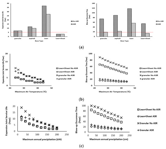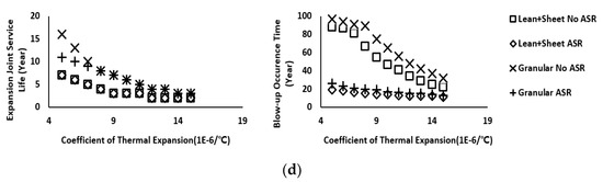 Various sensitivity analyses were performed to investigate the factors affecting the potential of pavement growth and blow-up, as shown in Figure 2. In the case of the lean concrete base using a plastic sheet with low frictional resistance, the service life of expansion joint is less than 5 years (Figure 2a). The maximum temperature is reported as an influence factor in the thermal expansion of concrete. In the case of lean concrete using a plastic sheet, as shown in Figure 2b, there is a very short service life of less than 5 years for the expansion joint, even at normal temperatures of about 23 °C. In addition, if ASR does not occur, blow-up occurs within 40 years in extreme conditions with maximum air temperatures exceeding 40 °C. On the other hand, blow-up occurs within 20 years in ASR conditions. As shown in Figure 2c,d, the service life of the expansion joint decreased as the precipitation and CTE of concrete increased. The probability of blow-up occurrence increased when precipitation and CTE increased.