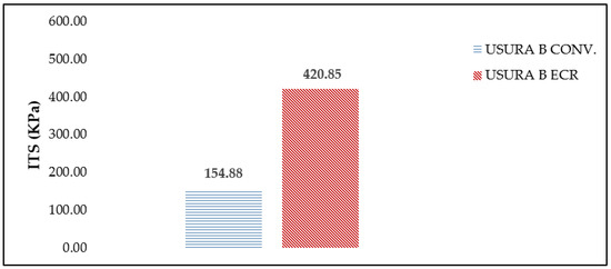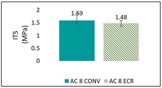 Conventional characterization included the indirect tensile strength (ITS). The ITS test was performed according to UNI EN 12697-23 at 25 °C on three replicates for each mixture investigated. Therefore, specimens did not need further temperature conditioning after curing. The indirect tensile strength is the maximum tensile stress calculated from the peak load applied at break specimen and the dimensions of the specimen, using Equation (1):