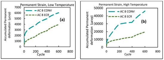 The average SSR test results for 20 °C and 54 °C are illustrated in Figure 3a,b. The trend was permanent deformation accumulation with an increasing number of cycles [4]. At the high temperature of 54 °C, the AC 8 ECR mixture displayed a minimum achievement of 19,434 µε in the permanent strain. This confirms that the modified asphalt mixtures were less susceptible to rutting, with an average percentage difference of 50% as compared to the conventional AC 8 mix.