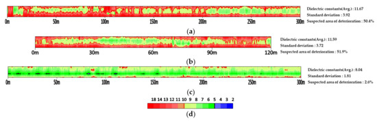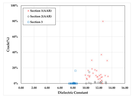 The average dielectric constants of existing pavements were 11.67 and 11.59 in Sections 1 and 2, respectively, which were very similar, and in the case of Section 3, it was 8.04, which was lower than those in Sections 1 and 2. The large dielectric constants values in Sections 1 and 2 may be due to the alkali-silicate gel caused by the AAR and the resulting concrete deformation [8]. The suspected deterioration area (with dielectric constants less than 5 and more than 10) in Sections 1 and 2 exceeds 50%, but in Section 3, it was very low at 2.6%.