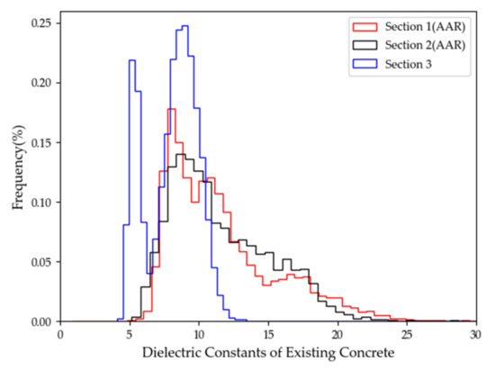 Figure 2 shows a comparison of the distribution of dielectric constants from the surveyed sections. Sections 1 and 2 (AAR) show similar patterns and are evenly distributed in the direction of high dielectric constants. On the other hand, the dielectric constant distribution in Section 3 is concentrated in the range of about 4 to 13.