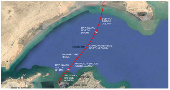 The target structure of this paper is a marine bridge with a total length of 36.14 km that connects Kuwait City to the new city of Subiyah, as shown in
