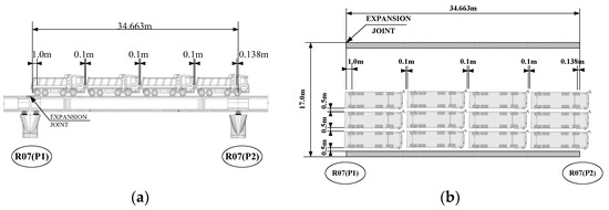 In this load test, a total of three types of measuring instruments were used, which are LVDT, strain gauge, and total station. The linear variable displacement transducer (LVDT) was installed at the position of the elastomeric bearing at the supporting point to measure the amount of deflection of the bearing, and the strain gauges were installed inside the box girder to obtain the strain value as shown in