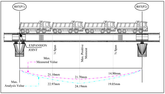 After the load test, additional amounts of defection were checked while maintaining the loaded vehicles for 24 h, but there was no change. In addition, it was identified that when all 12 loaded vehicles were removed, all the deflection was restored.