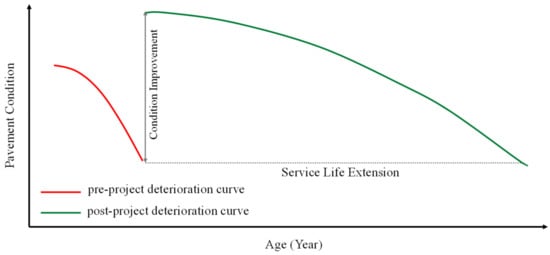 Using the service life extension and index benefits, the next step was a benefit-cost analysis. The life cycle cost analysis (LCCA) took two primary inputs for each distinct preservation treatment to determine their cost over the life cycle, namely, implementation cost and life extension. Implementation costs were calculated as shown in Table 2 based on the bidding tabulation data. Life–cycle cost was represented by the equivalent uniform annual cost () which was obtained from Equation (3):