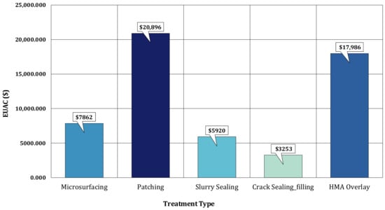 The life cycle cost analysis (LCCA) results, for a 10-year analysis period and 1.5% discount rate, are summarized in Figure 2. As the figure shows, crack/joint sealing demonstrated the lowest EUAC at USD 3253.160. Slurry sealing produced the next lowest value followed by microsurfacing, HMA thin overlay, and patching, with average EUAC values of USD 5920.129, USD 7861.798, USD 17,985.873, and USD 20,896.108, respectively.