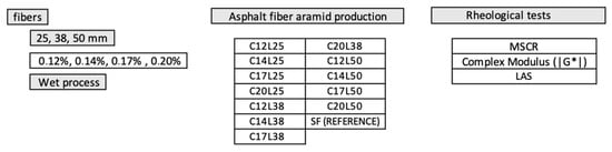 This work was carried out using 0.012 mm diameter aramid fibers with three different lengths, namely 25, 38, and 50 mm. These lengths suit asphalt mixtures with 12.5, 19, and 25 mm maximum aggregate sizes. These fibers were mixed into asphalt binder in 0.12%, 0.14%. 0.17% and 0.20% by weight of binder, meaning 12 asphalt binders were produced. They were tested for rheological properties through the MSCR (Multiple Stress Creep and Recovery), LAS (Linear Amplitude Sweep), and shear complex modulus tests, as represented in Figure 1. Test specimen names were defined based on the fiber content and fiber length, such as C12L25, meaning that fiber content is 0.12% and the fiber length is 25 mm. The SF specimen refers to asphalt binder without fibers, used as reference. The 35/50 pen asphalt binder was used.