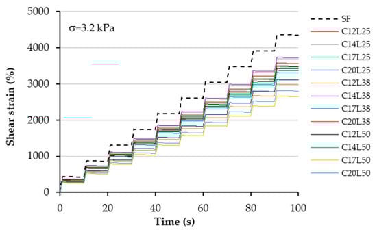 MSCR tests were carried out on all specimens to obtain the fiber-modified binder recovery. The evolution of the shear strain during the test for an applied 3.2 kPa shear strain is presented in Figure 3, where it is possible to observe a minimal recovery obtained in this experiment. It was expected for the base bitumen. The presence of fiber reduced the accumulation of rutting more than that obtained for the case without fibers. It can also be observed that longer fibers and their content minimize the accumulation of rutting.