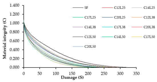 LAS tests on all specimens produced the results presented in Figure 4 and Figure 5, where a significant difference is visible between the cases studied in terms of curve slopes and energy (Figure 4). In terms of C-S characteristic curves (Figure 5), different behaviors are visible, meaning that the presence of fiber influences the asphalt-binder behavior. It is also observed that increasing the fiber’s content and length has a positive effect on the cracking resistance of the binder, meaning that there is an expected improvement of the fatigue resistance of the asphalt mixtures.
