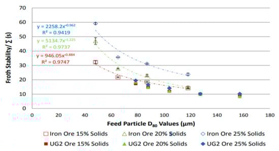 Ore mineralogy effects on froth stability were assessed by comparing two different ores, UG2 and iron ore [31], and dynamic froth stability was reported to increase exponentially with decreasing particle size, as shown in Figure 2. This is consistent with literature findings [32], which reported an inverse relationship between particle size and froth stability. Figure 3 shows that for a given particle distribution, the dynamic froth stability decreases as the airflow rate increases [20]. Furthermore, similar to Figure 2 and Figure 3 shows a decrease in dynamic froth stability as the feed particle size increases, thus implying that increasing the milling time and generally producing finer feed increases the dynamic froth stability. Froth height variations with time at different aeration rates illustrated these finding further [20].