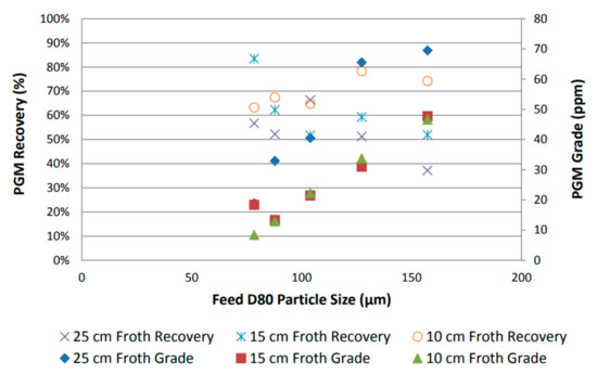 By using grade and desired mineral recovery as performance proxies, the overall flotation performance was assessed by plotting recovery as a function of feed particle size, as shown in Figure 4 [31]. An increase in PGM grade was observed with increasing particle size, and a reduction in PGM recovery was observed with an increase in froth height. Furthermore, a general increase in PGM recovery was observed with a decrease in feed particle size [31].