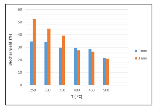The biochar yield decreases from 52% to 25% when produced at 250 °C from two different grain sizes of BP (Figure 1). An increase in the pyrolysis temperature leads to a reduction in biochar yield, likely due to the conversion of biomass composed from cellulose, hemicellulose, and lignin into gases and bio-oil at high temperatures. Particle size, temperature, and heating rate all interact to affect the biochar yield. Lower temperatures lead to higher biochar yields because of faster primary decomposition and devolatilization. The 1 mm grain size produced ash at a lower temperature (200 °C) than the 3 mm grain size (350 °C) due to differences in surface reactivity and other grain properties.