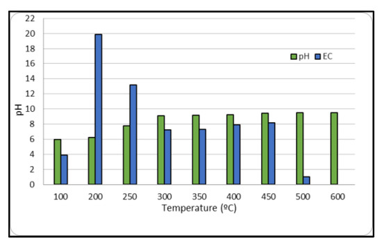 Figure 2 presents the obtained values of pH and electrical conductivity of BPB for the different temperatures. It shows that pH of biochar increases with carbonization temperature due to the formation of carbonates and inorganic alkalis. Biochar pH values range from 6.5 to 11, with BPB at T = 400 °C having a remarkably high pH value of 11. Electrical conductivity values also increase with pyrolysis temperature, but the values obtained in this study are lower than those reported in other studies [12]. This difference could be explained by the initial organic waste used and the adopted experimental conditions.