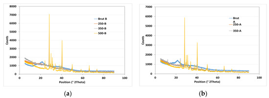 X-ray diffraction (XRD) analysis was used to study the structural order in carbon solids derived from banana peels biochar (BPB) at different pyrolysis temperatures and particle sizes. The loading of graphitic basal planes is observed at a 2θ value of 25°. The XRD pattern shows a different profile at 500 °C due to the appearance of chaolite and fullerene. Banana peel is thermally decomposed into chaolite and fullerene (Figure 3). The XRD peak intensities increase with increasing temperature, indicating the successive ordering of carbon in aromatic structures. Conversely, the increasing disorder trend is explained by the evolution of gas species forming throughout pyrolysis. The same peaks and their intensities are observed for the two particles sizes (1 and 3 mm), so particle size do not have any effect on the structural order in biochar.