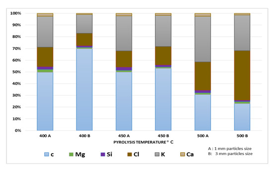 The composition of banana peel biochar (BPB) was analyzed, as shown in Figure 5. BPB contains mainly carbon, potassium, and chlorine. The percentage of these elements varied with pyrolysis temperature, and chlorine content was affected by particle size. Other minerals, such as calcium and magnesium, have been reported in varying levels in BPB due to differences in banana varieties, peel removal methods, and pyrolysis temperatures. The high percentage of chlorine in some banana peels may be due to pesticide contamination [13]. Further studies are needed to confirm the concentration and origin of chlorine in BPB and an elementary analysis should be conducted to determine the carbon and oxygen contents.