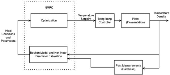 Figure 2 shows the nonlinear model predictive control strategy. All measurements were stored in a database (PI, OSIsoft, San Leandro, CA, USA). The timestep used was 30 min with a prediction horizon of 30 min. Every 30 min, the new and previous measurements of density and temperature were used to estimate the parameters of a wine kinetic model. The updated parameters were inputed into an optimization block.