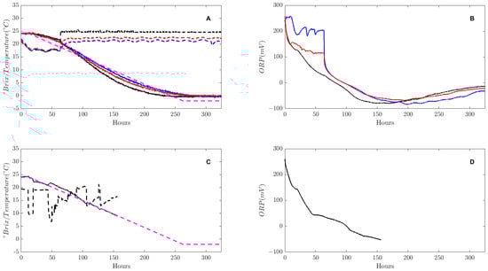 The measured °Brix and temperature (A) and ORP (B) at 21 °C (blue) 23 °C (red) and 25 °C (black). The measured °Brix, temperature and ORP for the MPC fermentation are shown in (C,D). The dashed purple line in A and C indicate the desired linear °Brix.