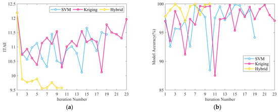 Figure 5, it can be seen that the two single-model optimization methods of Kriging and SVM require 10 and 23 iterations, respectively, while the hybrid iterative model reconstruction optimization method based on both Kriging and SVM only requires 10 iterations, which can quickly approach the optimal solution. In addition, as the number of iterations increases, the model accuracy in the hybrid iterative model reconstruction method remains above 95%, while the model accuracy in the two single-model optimization methods varies greatly. This indicates that the hybrid iterative model reconstruction method has high optimization efficiency.