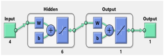 Modular artificial neural networks and a neuro-fuzzy system were built with a NN toolbox using MATLAB 2019 mathematical software. All of the calculations needed to evaluate adsorption efficiency were performed using Origin 2019. The RMSE, AARE, and MSE of the training and prediction sets were also used to identify the two models and the parameter changes. To evaluate how well the model can predict results from experiments that have not yet been seen and were not used for training, we included 26 experimental runs that were randomly divided into training, validation, and test sets (20-3-3). Averaging was performed across all samples. R2 is a standard statistical metric used to assess the extent to which experimental and model predictions vary. Figure 1 shows a three-layer system built with an input layer consisting of four neurons (Cr (VI) concentration, contact time, solution pH, and adsorbent dose), a hidden layer made up of nine different modes, and an output layer consisting of one neuron (4-6-1). The most widely used network, a back-propagation (BP-ANN), trains an algorithm for modelling experimental data using a first-order gradient descent method. This is a suitable method for minimizing mistakes throughout each cycle.