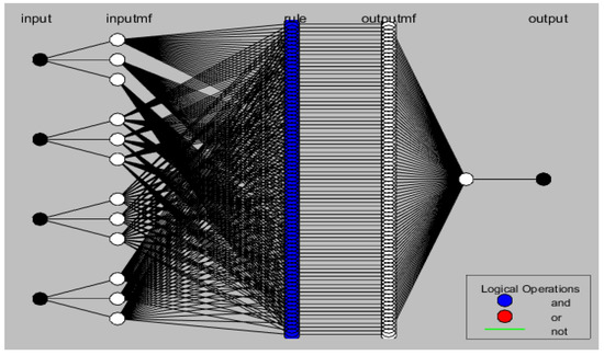 A fuzzy system’s membership parameters and rules are defined using a trial and error approach. A suitable model for the observed inputs and precise target values has to be developed using the ANFIS system. The product layer, normalized layer, fuzzy layer, defuzzy layer, and the final layer have all been identified as performing different tasks in this experiment (Figure 3).