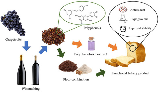 Winemaking generates waste in the form of grape pomace, seeds, and skins that remain after the wine has been pressed. Based on some estimates, approximately 20% of the total grape weight is disposed as waste in the form of seeds, stems, and skins, which can represent over 8 million tons of grape pomace waste worldwide [1]. Of this, grape seeds (GS) constitute the most environmentally persistent waste. Removal of this waste is costly and if it is not treated effectively, it may pose an environmental issue, since these seeds contain high levels of condensed tannins (CT) and other phenolic compounds (PC), that if concentrated, may have negative impacts on soil [1]. PC, however, have attracted a great deal of interest both by the industry and academia, since they have been reported to exert antioxidant, hypoglycemic, anti-obesity, anti-inflammatory, or cardioprotective effects, among many others [2]. Grape seeds have a high content of PC such as phenolic acids, monomeric PC (e.g., flavanols such as catechin or epicatechin), polymeric CT, and in the case of red grape varieties, several anthocyanins [3]. In addition, GS are one of the richest natural sources of resveratrol, a stilbene associated with highly promising anti-obesity effects [4]. On the other hand, there is an increasing demand of healthier foods prepared with natural ingredients, and this has given rise to functional foods which have potential health benefits besides their nutritional ones [5]. Therefore, one possible alternative for the management of GS as organic waste has been their application toward the fortification of several foodstuff, of which bakery products have emerged as the most feasible to produce, attractive to consumers, and easy to commercialize. Moreover, bakery products made with refined wheat flour generally lack a great quantity of nutrients and are often described as highly glycemic foods, since their only value is as highly energetic foods [6].