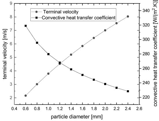 The terminal velocity and convective heat transfer coefficient of urea particles at different sizes when the air velocity is 0.63 m/s are shown in Figure 2. From the figure, it can be seen that the terminal velocity increases with an increase in particle diameter. The terminal velocity can achieve about 9 m/s when the diameter reaches 2.4 mm. On the other hand, when the particle size increases, the convective heat transfer coefficient decreases. The convective heat transfer coefficient becomes as low as 222 W/(m2·K) when the particle diameter is 2.4 mm. Therefore, with a higher falling velocity and lower heat transfer efficiency at a larger size of particles, it is more difficult for a coarser droplet to completely solidify in a prilling tower.