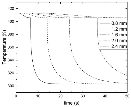 The temperature at the center of the droplets for various diameters is shown in Figure 3. From the figure, it can be observed that the solidification takes a longer time for the coarser particle. For the particle with a diameter of 2.4 mm, the center just reaches the freezing point and is still in the liquid phase after 50 s. For the smaller particles, such as the particle with a diameter less than 2.0 mm, the centers are completely transformed to a solid and cooled after 50 s.