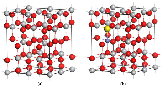 TiO2 exhibits three crystal phases, among which the anatase phase is the most photocatalytically active. Anatase TiO2 has a tetragonal structure with a symmetry group of I41/AMD and lattice parameters of a = b = 3.776 Å and c = 9.486 Å. Doping systems were constructed using a 48-atom anatase supercell with a 2 × 2 × 1 repetition. The (TM and S) co-doped configurations were constructed by replacing one oxygen atom with a sulfur atom and a Ti atom with a TM atom. The atomic ratio of TM to Ti was 0.0625, close to the value used in many experimental studies. The supercell with co-doped TM and S is shown in Figure 1.